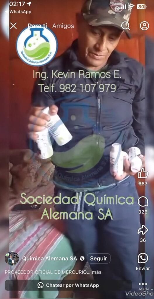 Pero los puestos de ferretería en Puerto Maldonado, o en otros asentamientos de pequeña minería informal e ilegal en el sur del Perú, no son los únicos donde se puede adquirir mercurio. Gracias a las redes sociales ahora cualquier interesado puede encontrar varios anuncios de su venta en Facebook, donde lo venden desde 170 hasta 28 mil dólares el kilo, dependiendo de la calidad. Algunos de los vendedores son empresas, otros solo muestran teléfonos de contacto y hasta supuestos testimonios de mineros satisfechos con la compra de este insumo.
