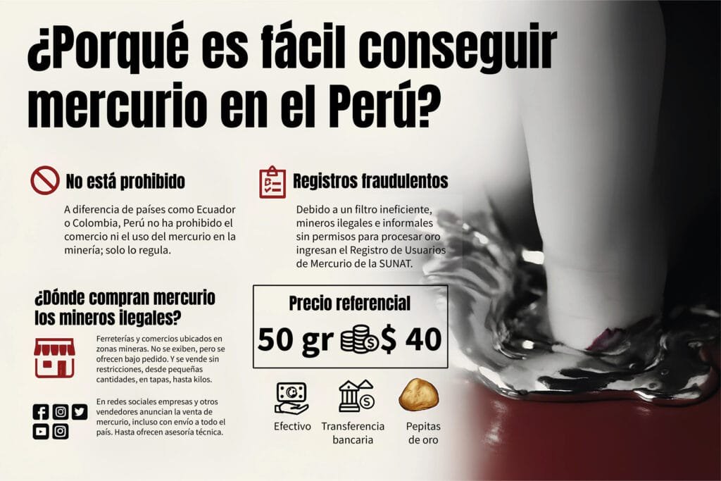 A diferencia de otros países, como Ecuador y Colombia, el comercio del mercurio en el Perú no está prohibido y tampoco se restringe su uso en la actividad minera. Esto a pesar de los altos niveles de contaminación de este metal líquido. Diversos estudios advierten que al entrar en contacto con el medio ambiente, se cuela en la cadena alimenticia: el mercurio es absorbido por las plantas y luego por animales herbívoros y carnívoros. Finalmente, el que está en la cima de la cadena es el más afectado. En muchos casos, es el ser humano. Además, los mineros que utilizan el mercurio y lo manipulan sin equipamiento especial, lo absorben a través de la piel. El daño más común es al sistema nervioso, provocando problemas motores, falta de coordinación, insomnio, dolores musculares y hasta la muerte.
