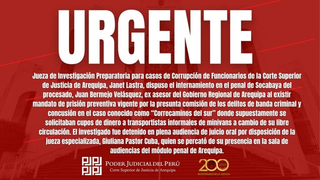 Bermejo será internado en el penal de Socabaya mientras el colegiado presidido por los jueces Ronald Medina Tejada, Giuliana Pastor Cuba y Juan Carlos Churata Quispe delibera sobre la eventual conversión o ejecución efectiva de la pena por los ‘Correcaminos del Sur’. El pronunciamiento del tribunal está programado para el próximo 11 de junio. La orden de internamiento en el centro penitenciario la dio la jueza Janet Lastra.