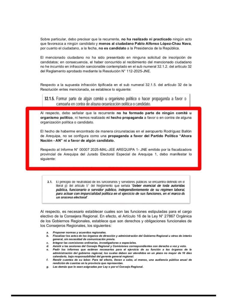 «Debo manifestar que no realicé ninguna actividad proselitista utilizando mi cargo como consejera, pues en ninguna de las imágenes presentadas aparece que haya ejercido mis funciones normativas, fiscalizadoras o de representación para favorecer a un supuesto candidato (…) debo precisar que los consejeros regionales, y menos la suscrita, no tenemos un horario de trabajo preestablecido por ninguna norma», añadió.