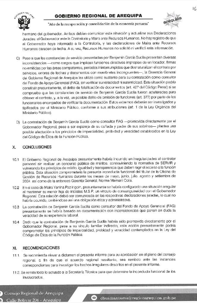 Tras una exhaustiva investigación, la comisión especial del Consejo Regional de Arequipa (CRA) reveló que las contrataciones de Benjamín García Suclla y Maira Yanina Paz Irigoin, familiares del gobernador Rohel Sánchez, estuvieron lejos de ser transparentes. En ambos casos hubo falta de competencia y evidencias de direccionamiento.