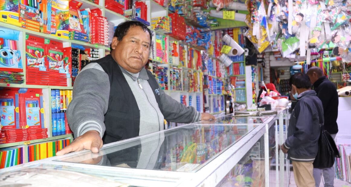 En la feria del Altiplano, todos lo conocen como Carlín. Es el último en cerrar, el que sigue atendiendo cuando los demás ya bajaron sus cortinas. A esa hora, cuando el frío arrecia y el silencio cae sobre los pasillos, su librería Mi Andreita sigue encendida.
