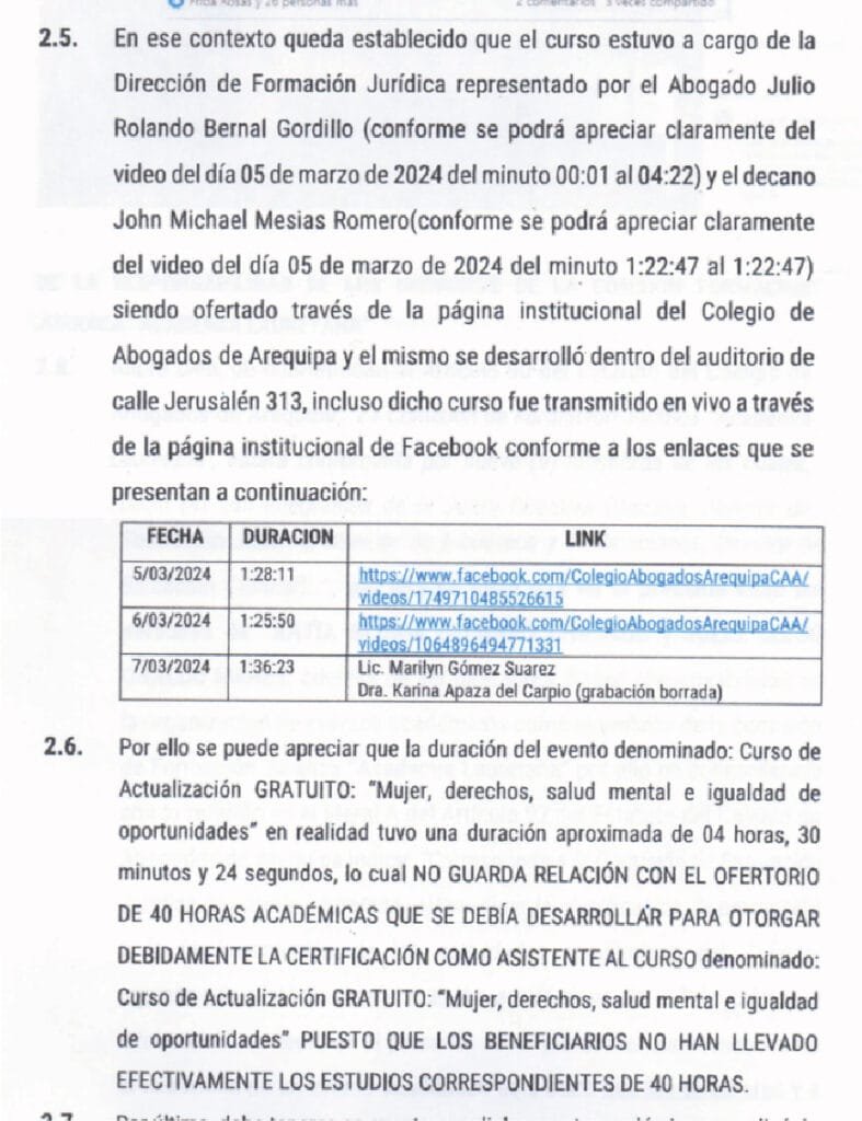 El segundo caso involucra el curso de actualización gratuito «Mujer, derechos, salud mental e igualdad de oportunidades», promocionado con 40 horas académicas. No obstante, la denuncia indica que la duración real de las sesiones grabadas y transmitidas en vivo a través de Facebook fue de aproximadamente 4 horas, 30 minutos y 24 segundos.