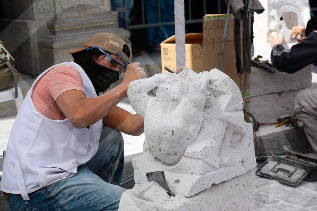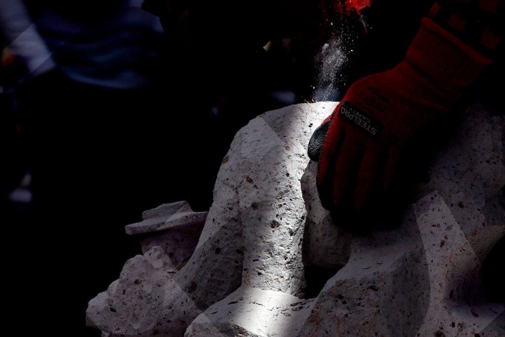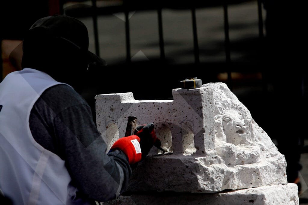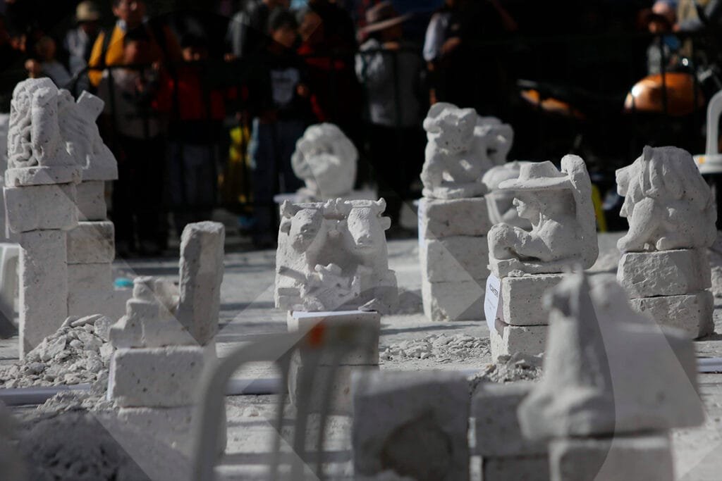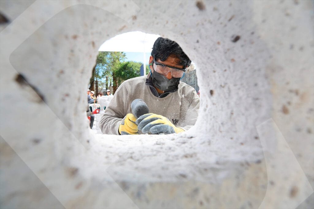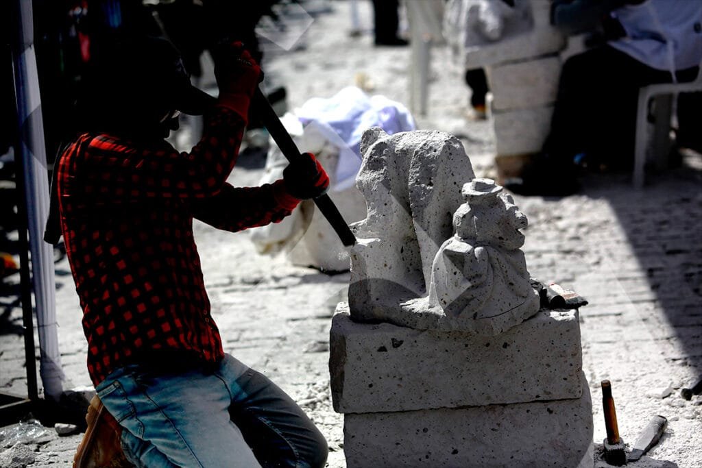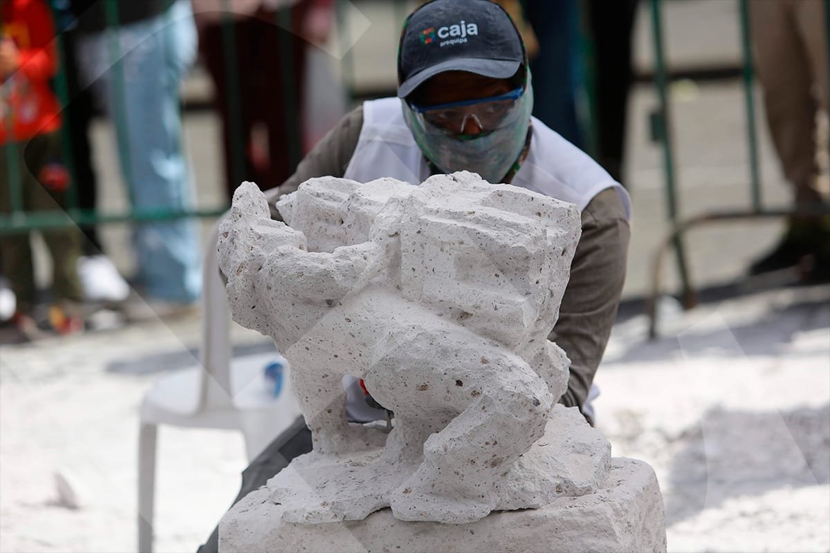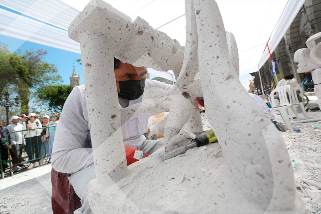 La mirada introspectiva de Miguel Ángel Meza, ganador del XXII Concurso de Tallado de Sillar, con su pieza «Catedral 2001, el peso de la herencia».Juan Carlos López presentó su obra «Sostenibilidad del patrimonio cultural, sillar», con la que obtuvo el tercer puesto.Durante tres días, los artesanos trabajaron la roca volcánica, dándole forma a sus obras con herramientas como cinceles y martillos.Un total de 34 escultores participaron en el concurso. Este año, la mayoría tenía entre 18 y 25 años.Con cada golpe, el sillar tomaba forma según la visión y el gusto del artista, mientras las astillas y el polvo salpicaban en el aire.La concentración evidenciada por cada participante, confirma el desafío que representa esculpir las figuras elegidas.Como todos los años, la Plaza de Armas fue testigo del proceso creativo de cada tallador, desarrollado frente al público.Este concurso ya es parte de la tradición cultural de Arequipa. Visitantes locales y extranjeros admiran una expresión artística única en el Perú.Julio Díaz, proyectista de profesión y formado en arte, se animó a participar por primera vez en el concurso. Su obra «La prisión del diablo», llamó la atención del público.Al igual que en las canteras, un artesano empuña la barreta para empezar a darle forma a su trabajo.El blanco del sillar se impone en el espacio. Algunas piezas son más llamativas que otras; entre tanto, los artistas aguardan con expectativa el veredicto del jurado.Al cierre del concurso, los ganadores Miguel Ángel Meza (primer puesto), Elmer Alvarado (segundo puesto) y Juan Carlos López (tercer puesto), presentan sus obras con orgullo.