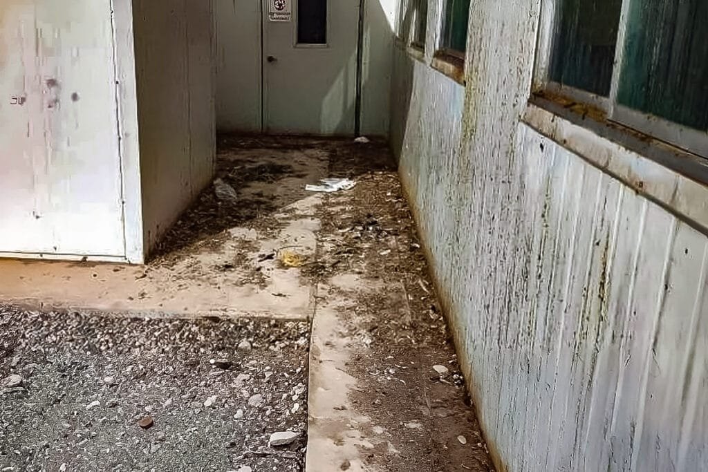 El hospital fue construido con material prefabricado, con largos pasadizos, salas de observación, una planta de oxígeno y consultorios, todo en un primer piso. Los profesionales de la Contraloría verificaron que todas las superficies exteriores de esta infraestructura estaban cubiertas con excremento, plumas de paloma y aves muertas.
