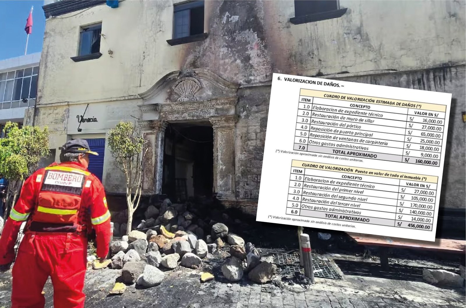 De acuerdo al reporte técnico, el 85 % de la fachada quedó comprometida. La emblemática puerta de madera de diseño colonial fue consumida en su totalidad por las llamas y gran parte del frontis presenta severas afectaciones. A ello se suma que la bóveda ubicada en el local resultó cubierta en un 80 % por hollín. Mientras que en el interior se detectaron alteraciones no autorizadas, como el tapiado de muros con bloques de sillar en ambos niveles.