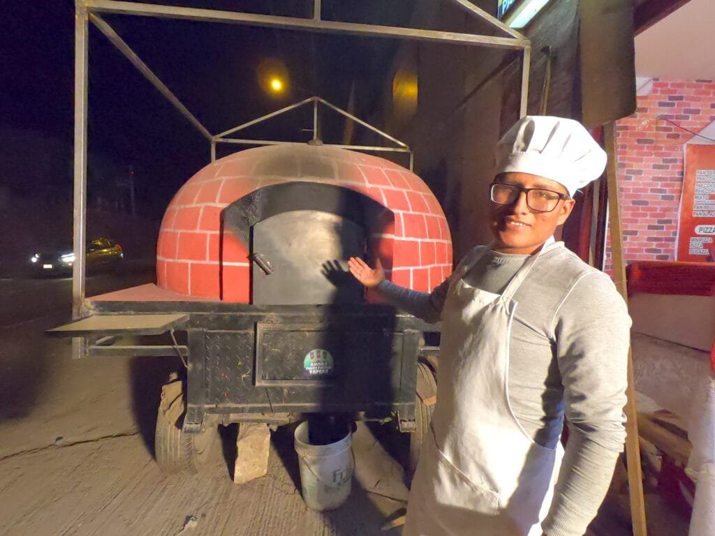 Hoy ofrecen panes serranos, rellenos de queso, jamón con orégano, aceituna, pan al ajo, manzana y hasta pizzas artesanales sin levadura. Nilton ríe cuando menciona que incluso inventaron una pizza dulce con leche condensada. El horno, colocado al aire libre junto a la carretera, se ha convertido en parte del “jale” del negocio.