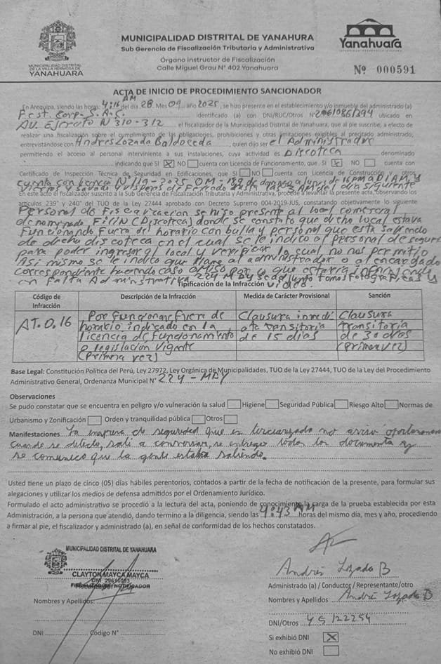 Incluso, este medio pudo acceder al acta Nº 0591 interpuesta el pasado 28 de setiembre y en la cual se puede ver claramente que se interpuso la medida provisional de clausura por 15 días por funcionar fuera del horario establecido. Incluso, el fiscalizador Clayton Mayca, advierte que pasadas las 4:16 de la mañana se escucha bulla al interior de la discoteca y se ve gente saliendo. Ante esto intentó ingresar pero el personal de seguridad del local no lo dejó pasar. Sin embargo, ante la evidencia del funcionamiento, Mayca preparó el acta. La misma fue firmada a las 4:43 de la mañana por Andrés Loayza, representante de la discoteca Filin. Este incluso no puso observación más que la excusa de que no le avisaron que los fiscalizadores estaban en la puerta del local.