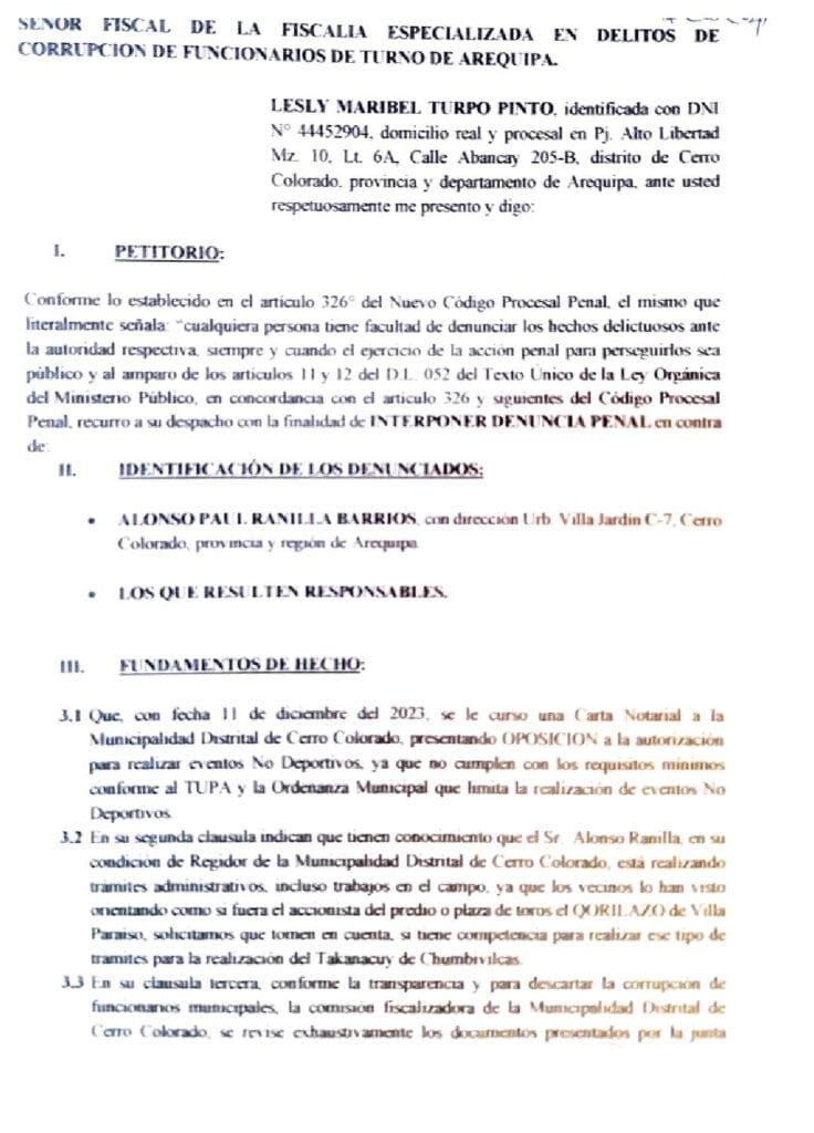 La denuncia detalla que el 11 de diciembre de 2023, se presentó una carta notarial dirigida a la entonces alcaldesa Gina García de Rodríguez, en la que vecinos del distrito expresaban su oposición a la realización de eventos no deportivos en la plaza de toros “El Qorilazo”, en Villa Paraíso, debido a incumplimientos del TUPA y ordenanzas municipales.