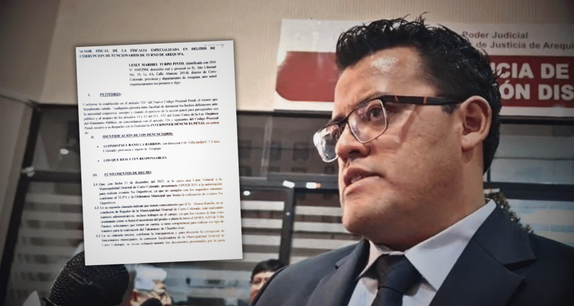 El regidor de la Municipalidad Distrital de Cerro Colorado, Alonso Ranilla Barrios, enfrenta una denuncia penal presentada ante el Ministerio Público por su colega, la concejal Lesly Turpo Pinto, quien lo acusa de haber influido en la entrega irregular de licencias de funcionamiento y participar en presuntos actos de tráfico de influencias, usurpación de funciones públicas y negociación incompatible.