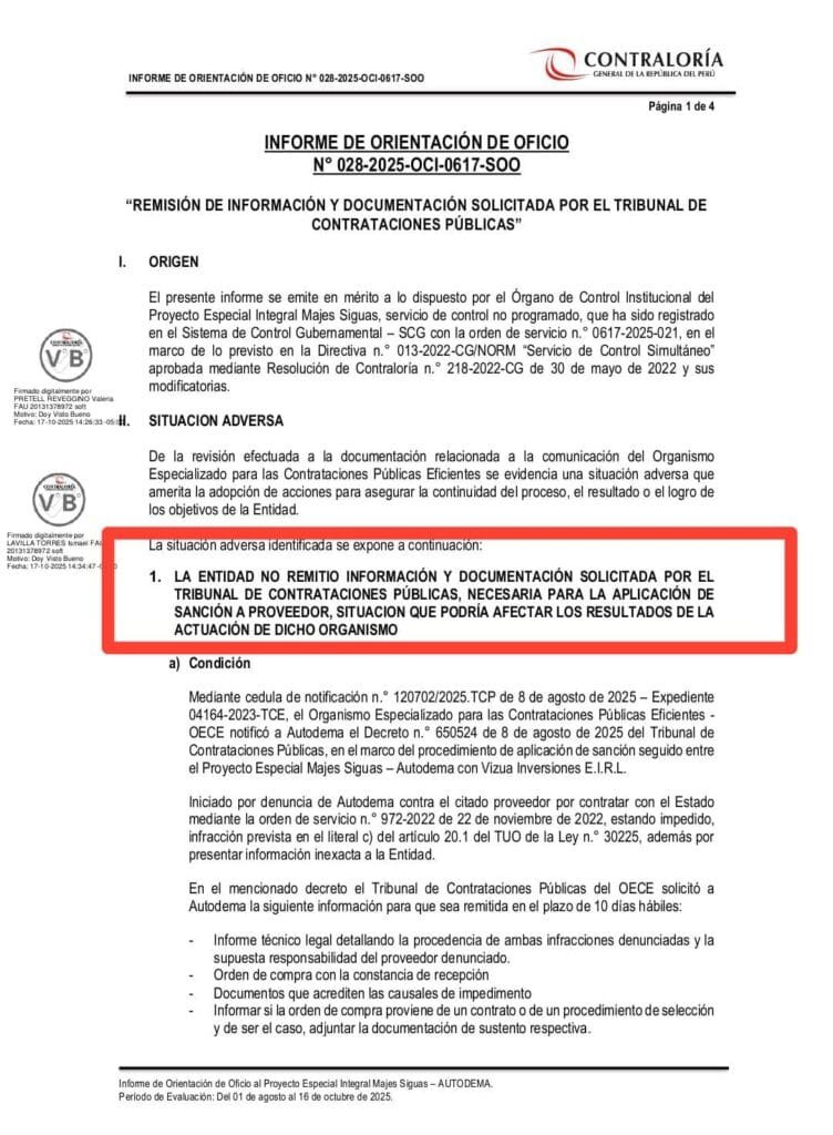 Según el Informe de Orientación de Oficio N.° 028-2025-OCI-0617-SOO, funcionarios de Autodema ignoraron reiteradas solicitudes para entregar información esencial al Tribunal de Contrataciones Públicas (TCP). Poniendo en riesgo todo un proceso sancionador y debilitando la capacidad del Estado para hacer justicia administrativa.