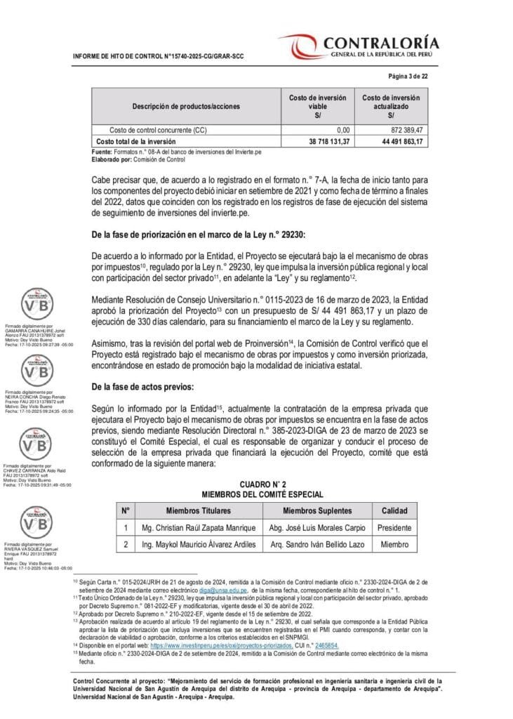 De acuerdo a la unidad contralora, el Comité Especial responsable de los actos previos está conformado por Christian Raúl Zapata Manrique (presidente), Maykol Mauricio Álvarez Ardiles y Miguel Neftalí Luque Plata, designados mediante Resolución Directoral N.º 385-2023-DIGA. Este grupo, según la Contraloría, omitió la evaluación de los efectos del Decreto Supremo N.º 132-2025-EF, que fijó un tope anual de inversión de S/ 20,8 millones para la UNSA. Pese a ello, no se solicitó el informe financiero correspondiente ni se ajustó el proyecto a dicho límite.