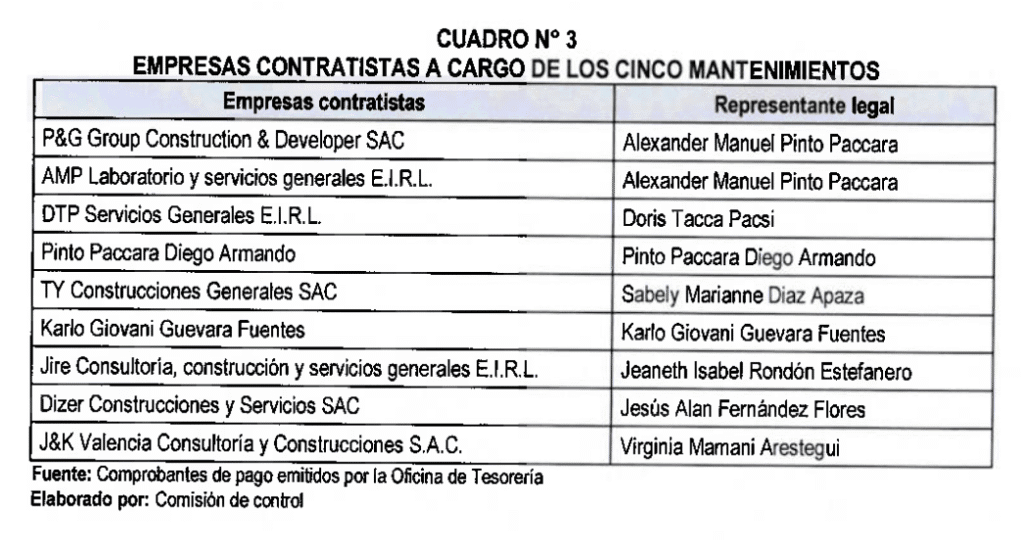 Para realizar estos mantenimientos, se adjudicaron servicios fraccionados a las empresas P&B Group Construction & Developer SAC, AMP Laboratorio y Servicios Generales, DTP Servicios Generales E.I.R.L., TY Construcciones Generales SAC, Jire Consultoría – Construcción y Servicios Generales E.I.R.L., Dizer Construcciones y Servicios SAC, J&K Valencia Consultoría y Construcciones SAC, Diego Armando Pinto Pacara y Karlo Giovani Guevara Fuentes, cuyos representantes legales de estas firmas son familiares.