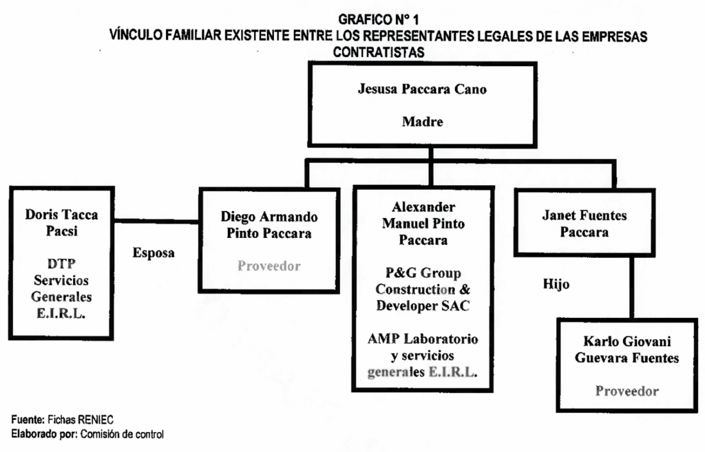 Precisamente, en el centro de la red familiar aparece Alexander Manuel Pinto Paccara, quien figura como proveedor natural y representante legal de las empresas P&G Group Construction & Developer SAC y AMP Laboratorio y Servicios Generales E.I.R.L., ambas beneficiarias de adjudicaciones para estos proyectos.