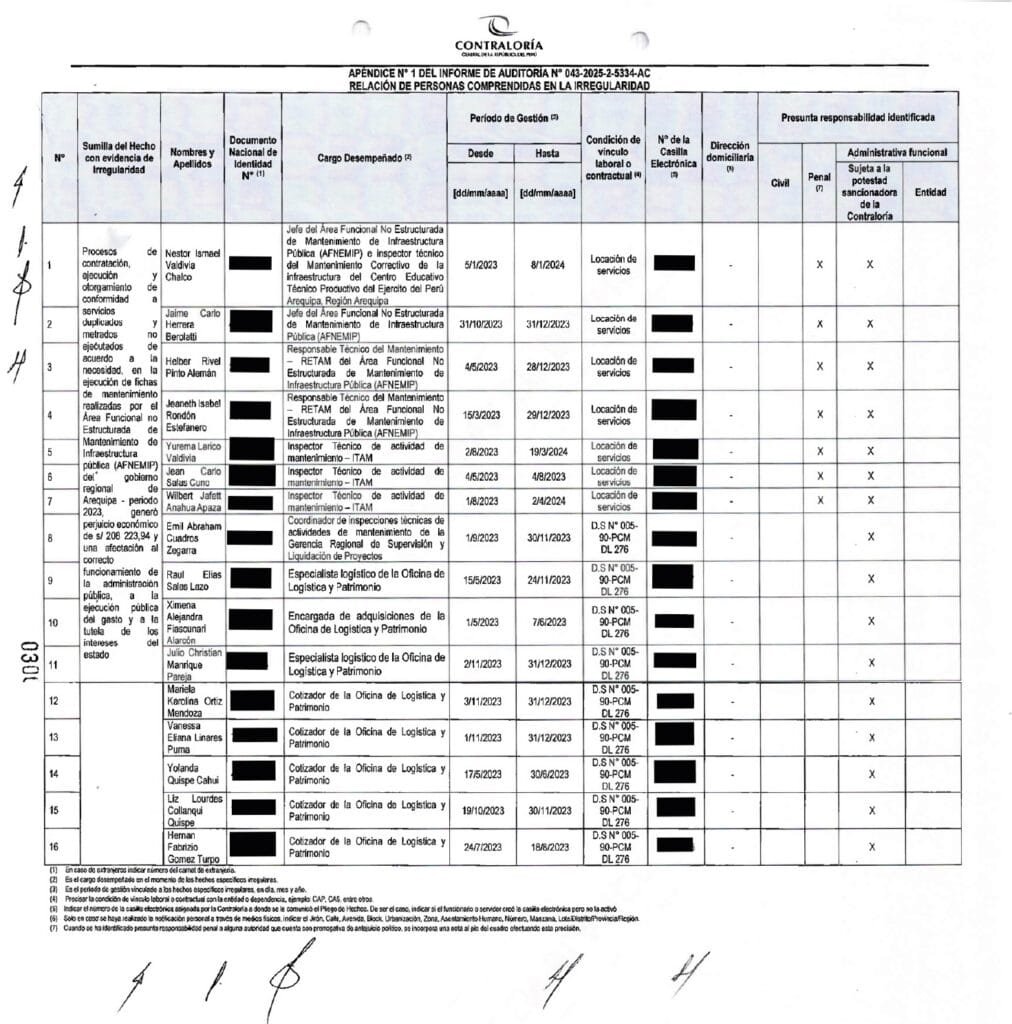 La Contraloría identificó además 16 funcionarios y servidores del GRA con presunta responsabilidad administrativa y penal, distribuidos entre la Gerencia Regional de Infraestructura, la Oficina Regional de Supervisión de Inversiones y Transferencias, AFNEMIP, la Oficina de Logística y Patrimonio y otras áreas técnicas relacionadas.