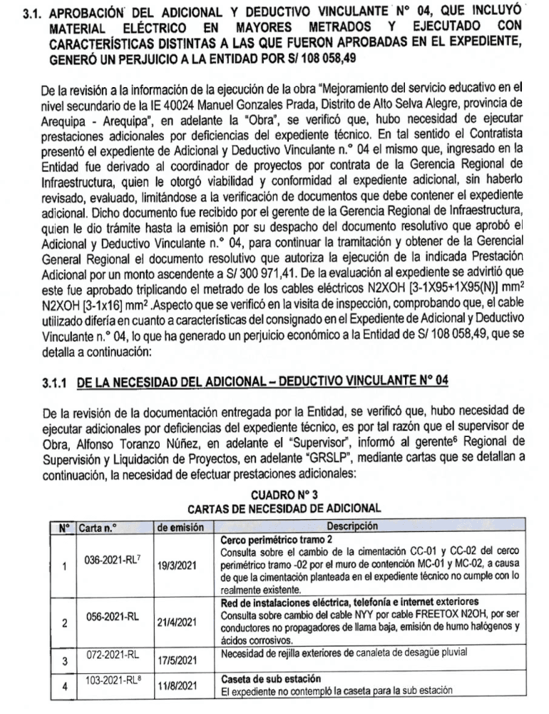 Es importante mencionar que, el adicional y deductivo en mención se sustentó originalmente en la necesidad de ejecutar trabajos no contemplados. Esto debido a las deficiencias del expediente técnico inicial. El supervisor de Obra, Alfonso Toranzo Núñez, fue quien informó a la Gerencia Regional de Supervisión y Liquidación de Proyectos (GRSLP) sobre estas necesidades mediante diversas cartas.
