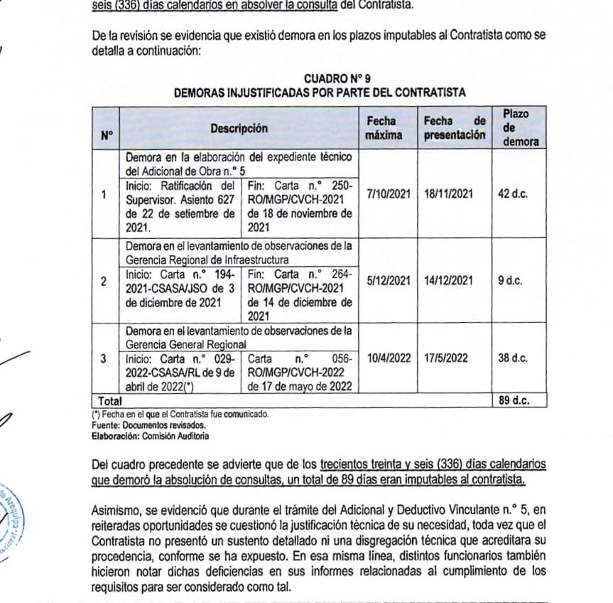 Las irregularidades se centran en la ejecución, recepción y liquidación del proyecto. En principio, la unidad contralora advierte el perjuicio producto de la aprobación del adicional y deductivo vinculante N° 04, una modificación al contrato que terminó generando un perjuicio directo a la entidad por un monto ascendente a S/ 108 mil 058,49.