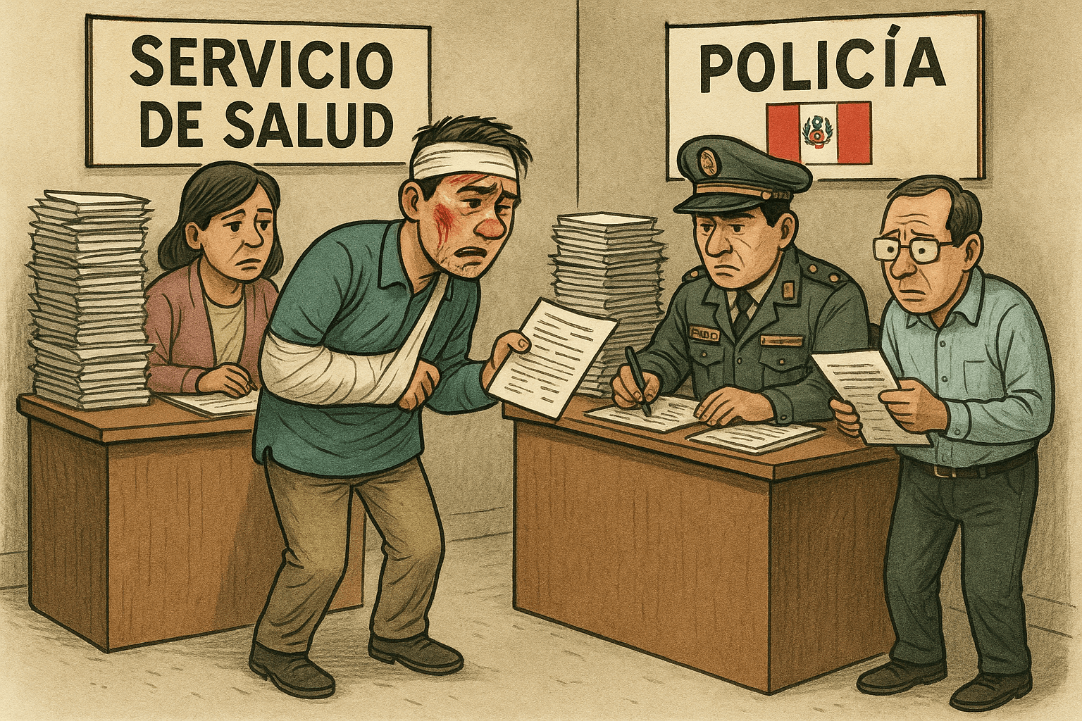 Si por mala fortuna sufres un accidente e interviene la Policía, entrarás a una vorágine de trámites: declaraciones, dosajes, reconstrucciones, papeletas, incautaciones, firmas, sellos, proveídos, copias de DNI, de partidas de nacimiento, certificados domiciliarios y un sinfín de papeleo. Si tienes lesiones, paralelamente irás a un hospital donde enfrentaras la indiferencia de su personal y una serie de trabas que impedirán una atención médica célere, oportuna y humana.