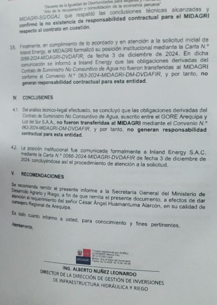 “Del análisis técnico-legal efectuado, se concluyó que las obligaciones derivadas del Contralo de Suministro No Consultivo de Agua, suscrito entre el GORE Arequipa y Luz del Sur S.A.A, no fueron transferidas al MIDAGRI mediante el Convenio N.o 063-2024-MDAGRI-DM-DVDAFIR, y por tanto, no generan responsabilidad contractual para esta entidad”, reza el oficio de respuesta N° 02644-2025-MIDAGRI-DVDAFIR/DGIHR. El mismo que está firmado por el director general de la Dirección de Infraestructura Hidráulica y Riego del Midagri, Rafael Ignacio Palacios Pérez.