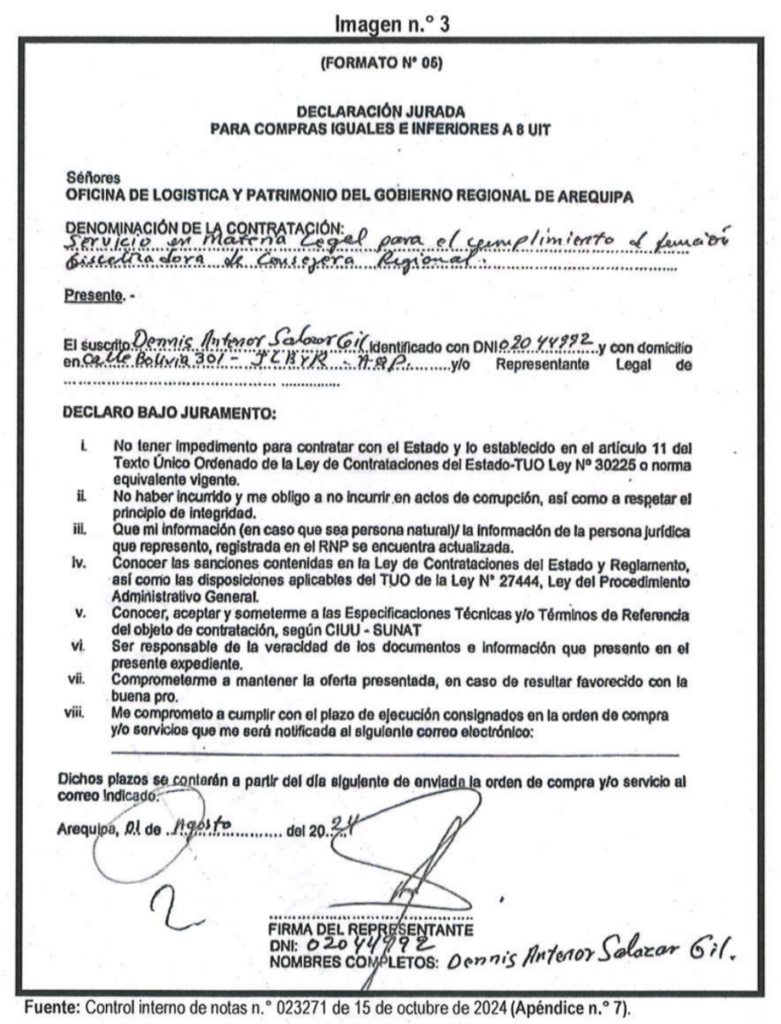 Esta situación no fue un hecho aislado ni accidental. Durante el ejercicio de su alto cargo municipal, Salazar suscribió una segunda contratación con el GRA el 19 de agosto de 2024 (orden n.° 0005222) por la suma de S/ 7 mil. Para lograr este segundo contrato, el funcionario presentó una declaración jurada en la que aseguraba no tener ningún impedimento legal para contratar con el Estado, a pesar de que ya ostentaba el cargo de confianza en la comuna.