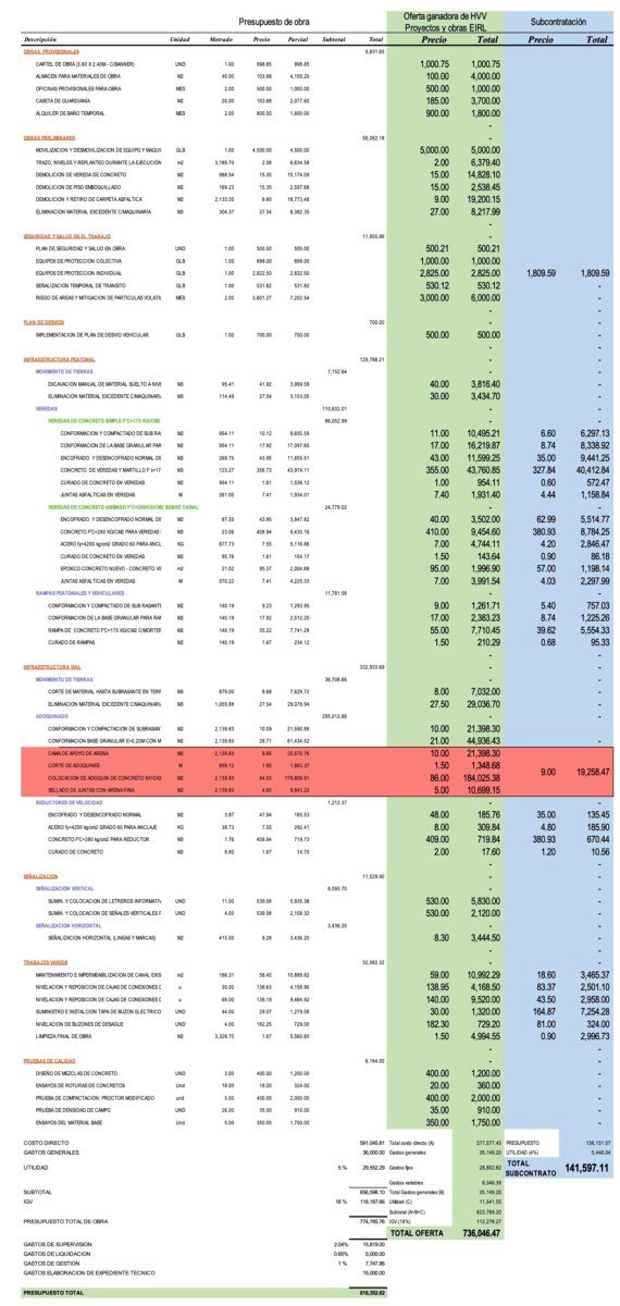 Para lograr que un presupuesto original de S/ 373 mil caiga hasta S/ 141 mil —que representa el 38 % del valor original—, Miguel Ángel Valencia Chávez ofreció a Luis Ramos Oviedo un presupuesto con varias reducciones. Por ejemplo, por el Item Equipos de protección individual, la empresa HVV Proyectos y Obras EIRL ofreció al municipio un valor de S/ 2 825, pero lo subcontrató con Luis Ramos a S/ 1 809.59. Otro ejemplo, el Item Conformación de la base granular para veredas fue ofertado por 17 soles el metro cuadrado, pero lo subcontrataron por apenas S/ 8,74 a Luis Ramos; es decir a la mitad de precio, pasando de S/ 16 219 en la oferta al municipio a solo S/ 8 338 para su ejecución real.