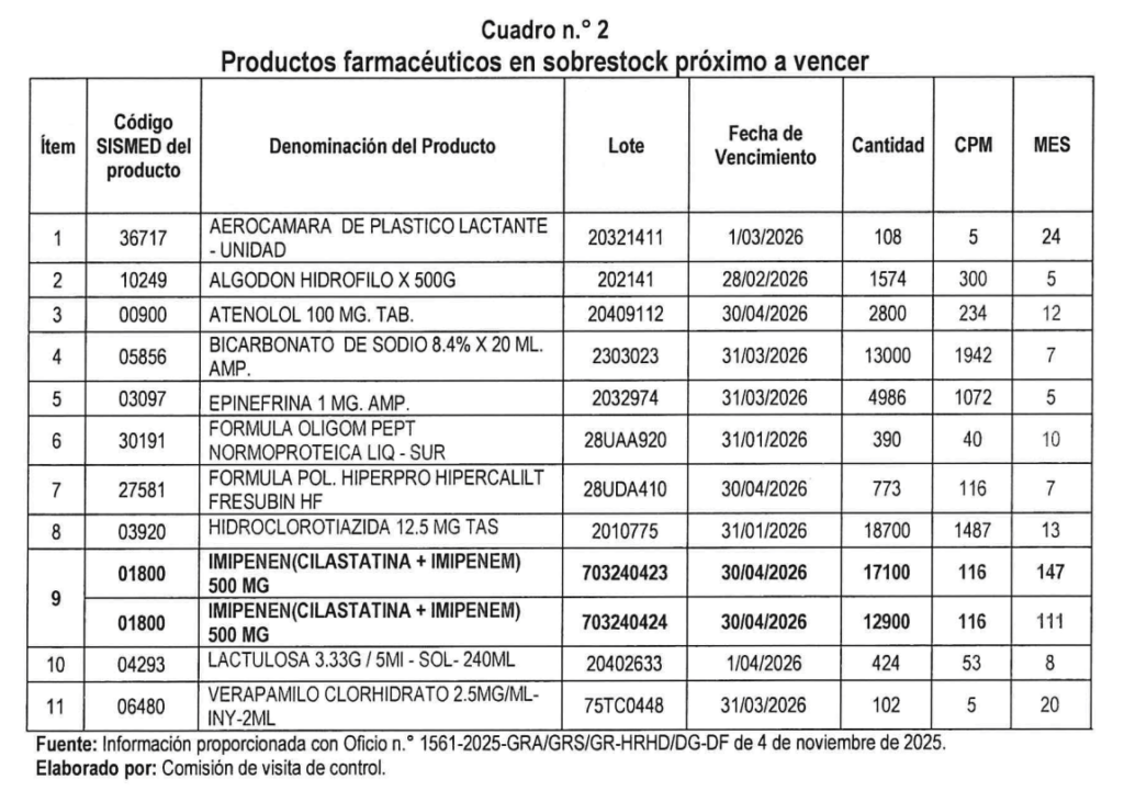 El informe también revela una gestión deficiente en el almacén de farmacia. Se identificó la existencia de productos farmacéuticos en estado de desabastecimiento, substock y, paradójicamente, un algunos con peligroso sobrestock. Los productos en exceso, según el informe, están próximos a vencer entre enero y abril de 2026. Esto implica una pérdida económica inminente para el Estado y, además, una mala planificación que afecta la disponibilidad de otros insumos.