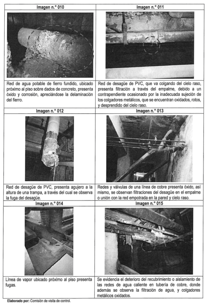 La infraestructura del hospital presenta un deterioro que va más allá de lo superficial. En el sótano del bloque principal, la unidad contralora constató un deterioro avanzado de las instalaciones de agua, desagüe y vapor, con fugas constantes y acumulación de agua. Esta situación no solo afecta los servicios mecánicos y sanitarios, sino que es el origen de un problema estructural mayor.
