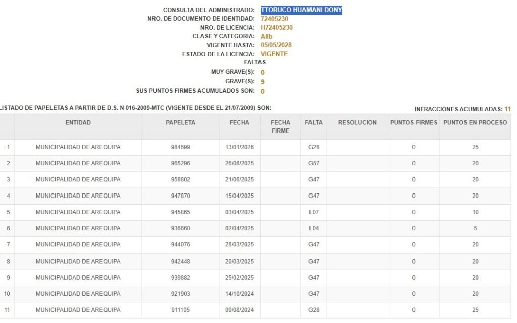 La escena comenzó con un solo conductor. Dony Ttoruco Huamaní circulaba por la intersección de Vidaurrázaga con Andrés Avelino Cáceres prestando servicio sin autorización. No tenía Seguro Contra Accidentes de Tránsito (SOAT). Su vehículo acumulaba infracciones graves y una deuda cercana a los 10 mil soles por papeletas impagas. La intervención terminó con la unidad rumbo al depósito municipal, en medio de resistencia y denuncias de presunto maltrato.