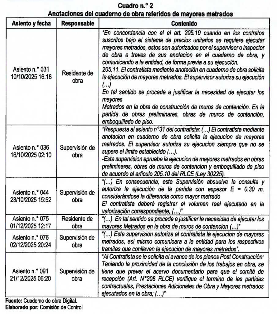 Una segunda irregularidad identificada está relacionada con el sistema de contratación. Las bases integradas del proceso establecieron que la obra se ejecutaría bajo el sistema de suma alzada. Esto implica que el contratista asume el riesgo de metrados y costos. Pese a ello, el residente de obra solicitó la aprobación de mayores metrados, los cuales fueron autorizados por la supervisión.