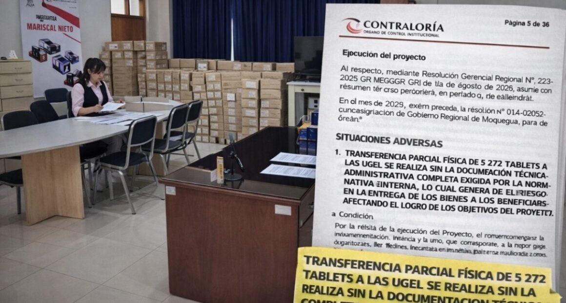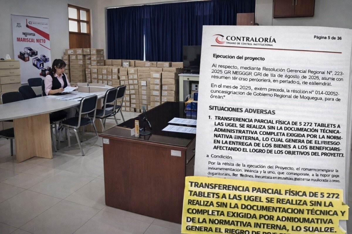 Más de 5 200 tablets destinadas a escolares de Moquegua presentan riesgos en su proceso de distribución. La Contraloría General de la República, a través del Órgano de Control Institucional (OCI) del Gobierno Regional, alertó sobre serias deficiencias administrativas, de seguridad y almacenamiento en la transferencia de los dispositivos tecnológicos adquiridos para instituciones educativas públicas.