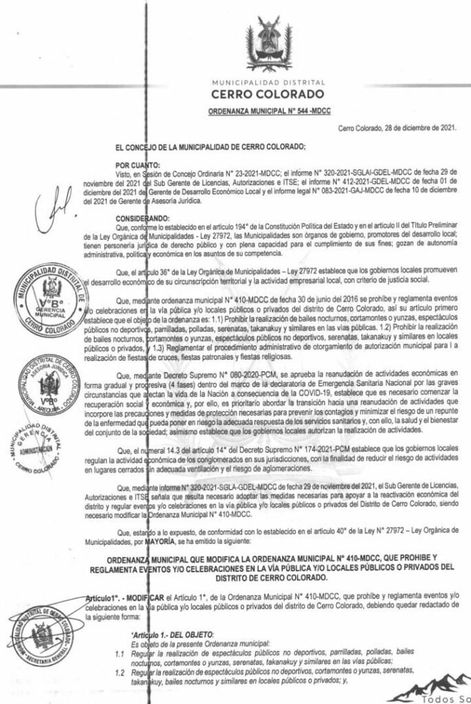 Y con el fin de evitar desgracias, accidentes y descontroles, o incluso muertes como ocurrió en muchas ocasiones, tras la caída del árbol aplastando a unos de sus participantes; la Municipalidad de Cerro Colorado, a través de la Sub Gerencia de Fiscalización y Licencias, a cargo del Abog. Marco Antonio Zanabria, ha iniciado una campaña masiva de prevención y exhortación en su jurisdicción, dirigido a los organizadores de estos eventos populares y población en general.