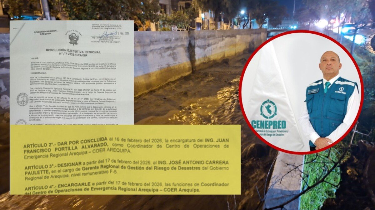 En medio de las emergencias provocadas por el incremento de lluvias en la región, el Gobierno Regional de Arequipa (GRA) dispuso el cambio del gerente regional de Gestión del Riesgo de Desastres. Según la Resolución N.° 075-2026, a la cual Revelación.pe tuvo acceso; oficializa la salida de Juan Francisco Portilla Alvarado y la designación de José Antonio Carrera Paulette.
