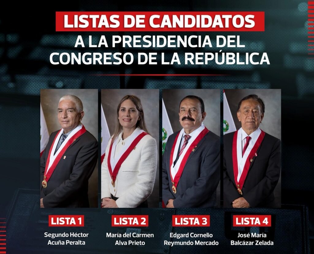 Hasta las seis de la tarde de este martes, las bancadas tenían plazo para presentar sus listas de candidatos. Cuatro postulaciones fueron formalizadas. María del Carmen Alva, de Acción Popular, presentó su candidatura mediante oficio registrado a las 16:43 horas. Por el grupo Honor y Democracia, Segundo Héctor Acuña Peralta formalizó su inscripción a las 16:37. Desde Perú Libre, José María Balcázar Zelada ingresó su postulación a las 12:23. Finalmente, Edgard Reymundo confirmó públicamente su participación, prometiendo garantizar transparencia y consensos.