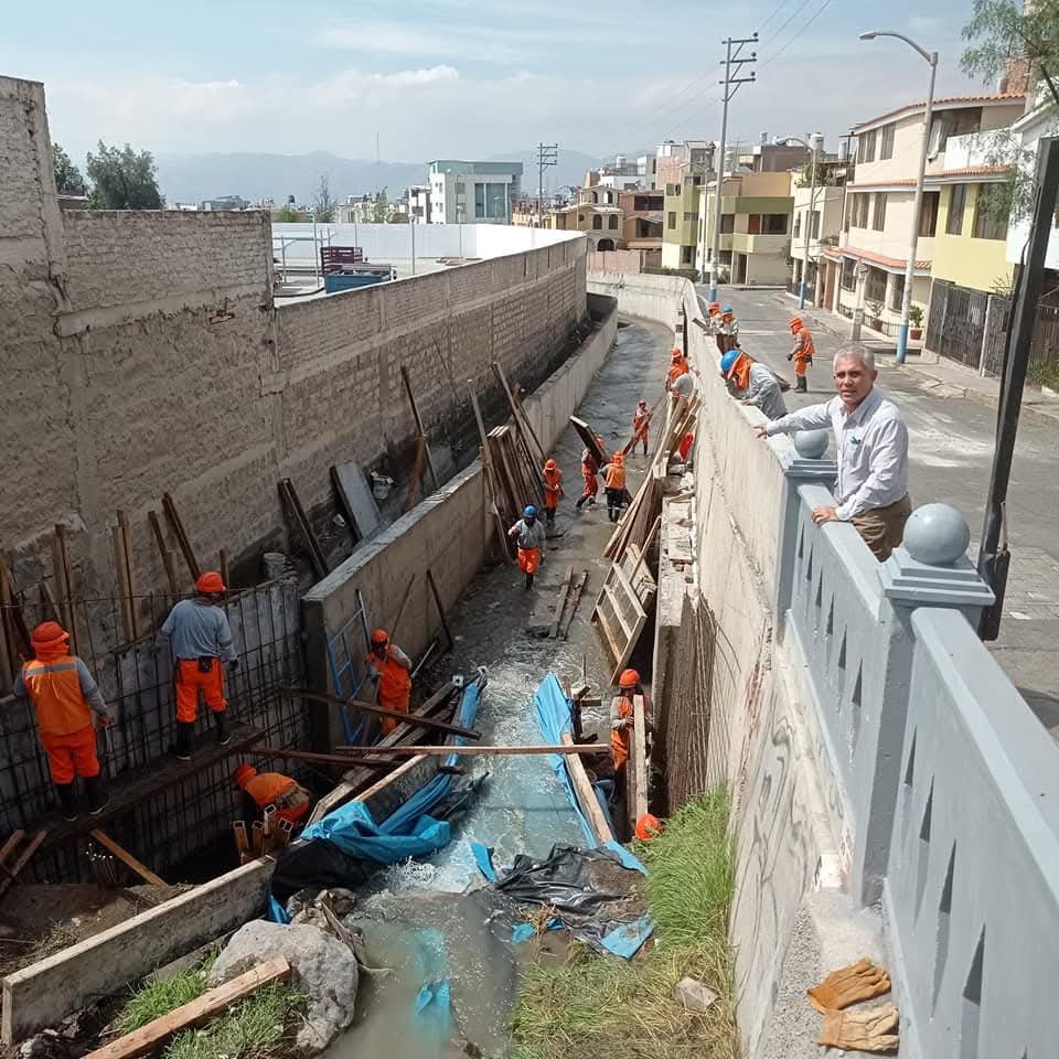 Sin embargo, la versión fue cuestionada y desmentida por Víctor Rodríguez, coordinador del colegio, quien presentó publicaciones oficiales de la Municipalidad de Yanahuara del 28 de enero de 2023. En ellas se anunciaba la reanudación de trabajos de encauzamiento y construcción de muros en la torrentera “gracias a las gestiones del alcalde Sergio Bolliger”, incluyendo imágenes del encofrado y levantamiento de muros en la zona ahora señalada como invasión privada.
