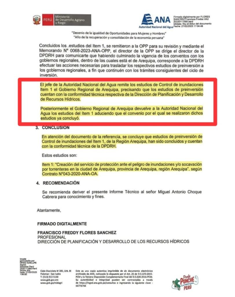 El asesor técnico Elvis Jump sostuvo que desde años atrás existían advertencias claras sobre el peligro. Recordó que la Autoridad Nacional del Agua (ANA) elaboró un estudio técnico para la protección ante inundaciones en la cuenca Quilca-Vítor-Chili, el cual identificaba zonas críticas y riesgos de huaicos en la ciudad, no obstante, este documento, entregado al Gobierno Regional en 2023, fue devuelto por razones administrativas, lo que paralizó su ejecución.