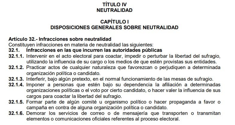 Según explicó, la normativa sobre neutralidad, supervisada por el Jurado Nacional de Elecciones y aplicada por los Jurados Electorales Especiales; prohíbe que autoridades en funciones, como consejeros regionales, alcaldes o regidores, expresen apoyo o rechazo a favor de una agrupación política o candidato durante un proceso electoral.