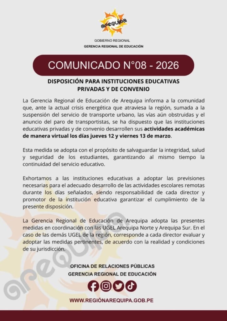 A través del Comunicado N.° 08-2026, la entidad explicó que la medida responde a la actual crisis energética, la suspensión parcial del transporte urbano y las dificultades en algunas vías de la ciudad. El objetivo es salvaguardar la seguridad de los estudiantes y garantizar la continuidad del servicio educativo.