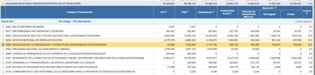 Según la pagina de Consulta Amigable del Ministerio de Economía y Finanzas (MEF), hasta el 11 de marzo del presente año, en el ítem; reducción de vulnerabilidad y atención de emergencias por desastres, refiere que la gestión de Alfredo Benavente, recibió un Presupuesto Institucional Modificado (PIM) de S/. 1,202,484, sin embargo, la MDASA logró certificar S/. 1,175,766.