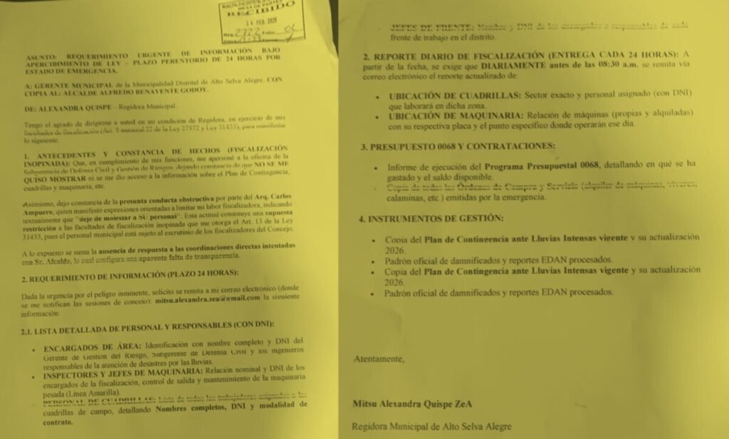 La regidora aseguró además que ha solicitado formalmente información mediante documentos ingresados por mesa de partes el 24 de febrero, y hasta el momento no ha recibido respuesta alguna sobre el tema. “La normativa indica que deberían responder en pocos días, pero ya han pasado más de diez y no me entregan la información”, indicó.