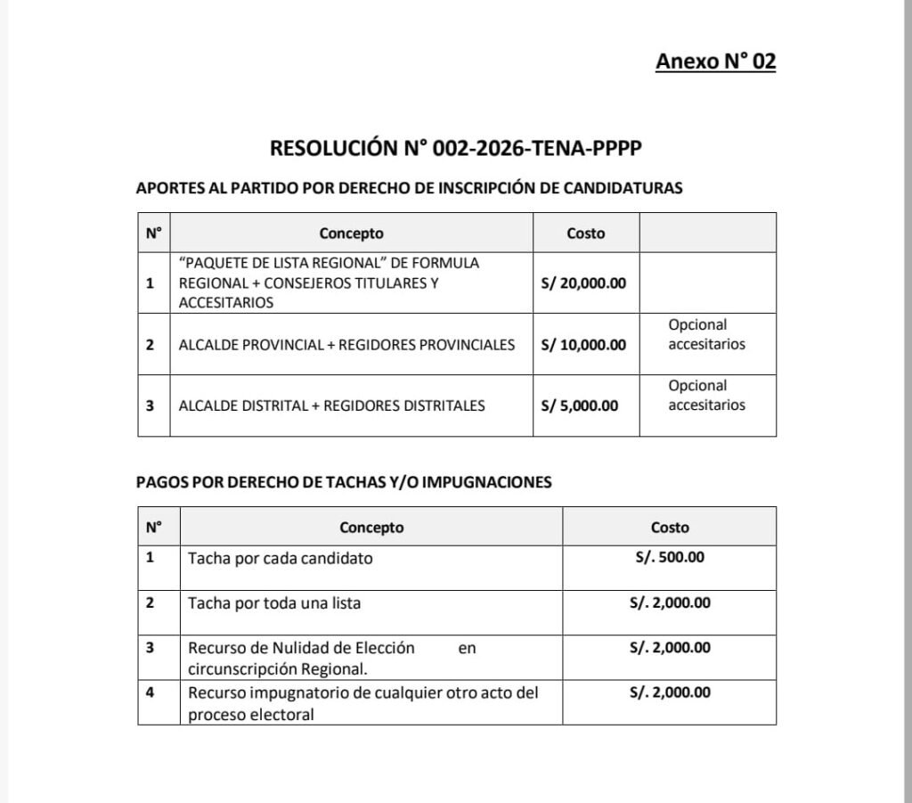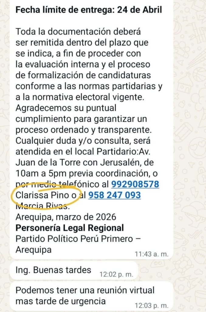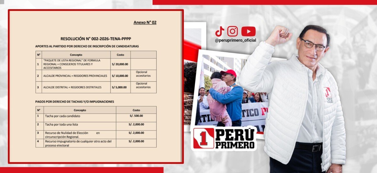 Asimismo, según un Comunicado Oficial de dicha agrupación, señala el cumplimiento de presentar requisitos exigidos por el partido para la inscripción de candidaturas, con el pago de tasas de Participación, según la Resolución 002-2026-PPPP y que dicho pago se realiza directamente a la cuenta del Partido Político Perú Primero, siendo la fecha límite de entrega el 16 de marzo.