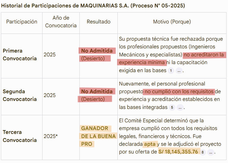 En la primera convocatoria realizada entre junio y agosto de 2025, Maquinarias S.A. fue descartada al no superar la evaluación técnica; en la segunda oportunidad, en septiembre del mismo año, volvió a presentarse, pero el proceso fue declarado desierto debido a que no cumplió con el perfil técnico exigido en las bases. Sin embargo, en la tercera convocatoria, realizada en diciembre de 2025, Maquinarias S.A. fue el único postor formal que presentó una propuesta y terminó adjudicándose la buena pro.