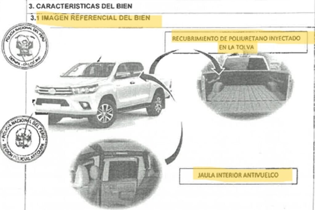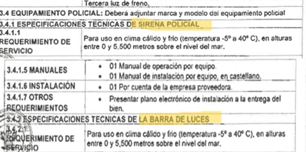 Diario Revelación, revisó a detalle las bases integradas de este último proceso, y resulta que las camionetas adquiridas para patrullaje policial únicamente contarán con jaula antivuelco, sirena policial y barra de luces, un equipamiento mínimo que dista de los estándares tecnológicos utilizados actualmente en operaciones policiales.