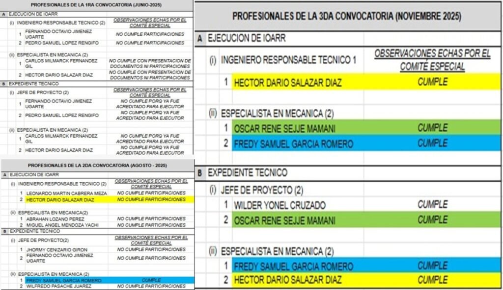 En la revisión final, incluso se admitió al ingeniero Héctor Darío Salazar Díaz, quien inicialmente había sido observado, permitiéndole desempeñarse al mismo tiempo como Ingeniero Responsable Técnico de la ejecución y como Especialista Mecánico en la elaboración del expediente técnico. A ello se suma que la experiencia mínima exigida para los profesionales se redujo de tres a un año.