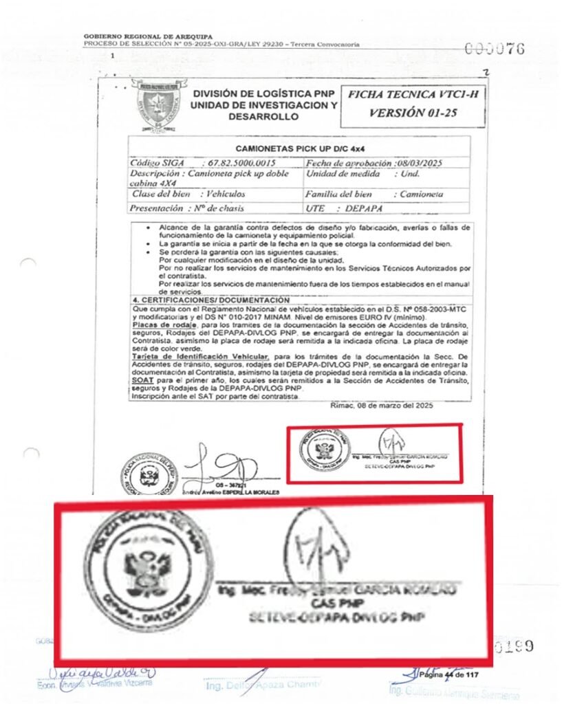 La comparación de documentos revela uno de los hechos más delicados del proceso. El 8 de marzo de 2025, el ingeniero García Romero firmó y selló la Ficha Técnica VTC1-H, documento que establece las especificaciones técnicas del Estado, en su calidad de personal de la División de Logística de la Policía Nacional. Sin embargo, entre noviembre de 2025 y enero de 2026, el mismo profesional fue evaluado y admitido como Ingeniero Mecánico Especialista en la propuesta de Maquinarias S.A. durante la tercera convocatoria del proceso.