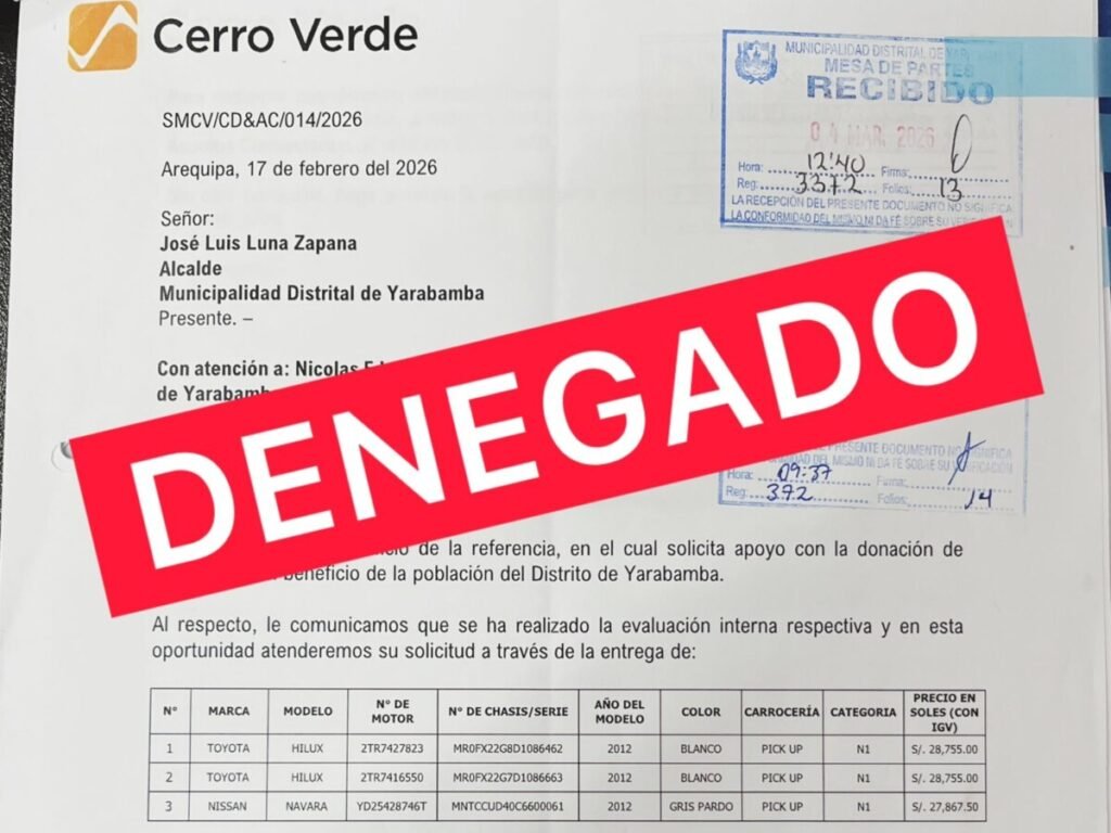 El Concejo Municipal de Yarabamba rechazó, por el momento, una propuesta de donación presentada por la empresa Sociedad Minera Cerro Verde, que pretendía entregar tres camionetas usadas del año 2012 a la municipalidad distrital. La iniciativa generó cuestionamientos entre los regidores debido a la antigüedad de los vehículos y a las millonarias utilidades que la compañía registra en los últimos años.