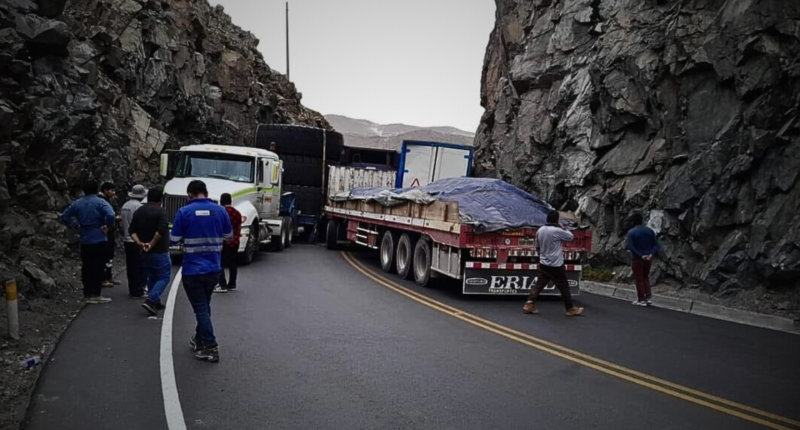 Un camión trató de cruzar la zona conocida como la “Curva del Cura” quedando atorada entre dos camiones. Gran cantidad de vehículos se encuentran varados sin poder salir ni ingresar de la ciudad de Arequipa.