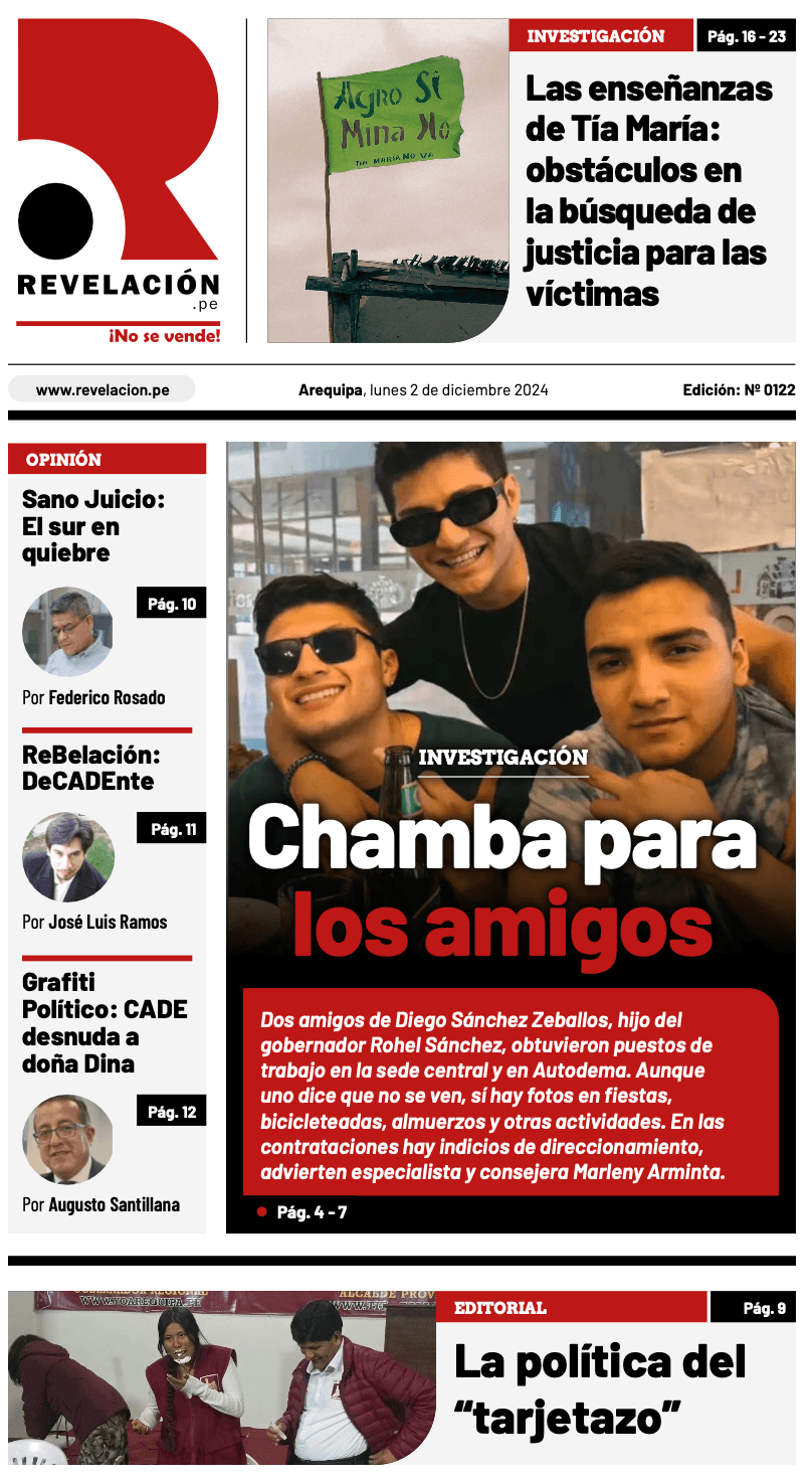 Edición 2 de diciembre del 2024 Edición 2 de diciembre del 2024lecturas 0 Director: Roberth Orihuela QuequezanaJefe de web: Dirceu Chávez QuintanillaRedactores: Javier Huaraya PérezPablo Rojas HuayapaAstrid Tarazona ZeaRomario Huamani HuamaniContacto: revelacionaqp@gmail.comDenuncias: 991335255