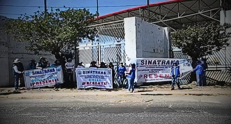 Trabajadores del sindicato Sinatrana protestaron en los exteriores del centro de convenciones Cerro Juli, donde se encontraba el ministro de Agricultura participando de una reunión. Los empleados denuncian el incumplimiento de un fallo arbitral que ordena el pago de bonos y exigen la migración de trabajadores al régimen 728.