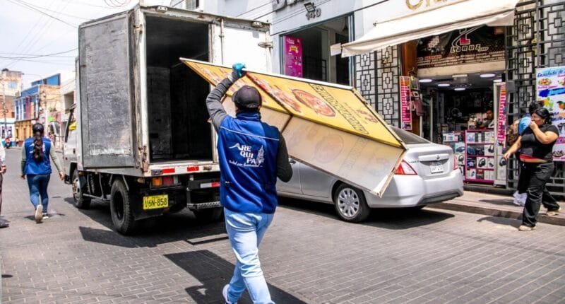 La Municipalidad de Arequipa ejecutó un operativo en el Cercado para retirar letreros, estructuras y elementos del comercio ambulatorio que ocupaban ilegalmente espacios públicos y afectaban el orden urbano.