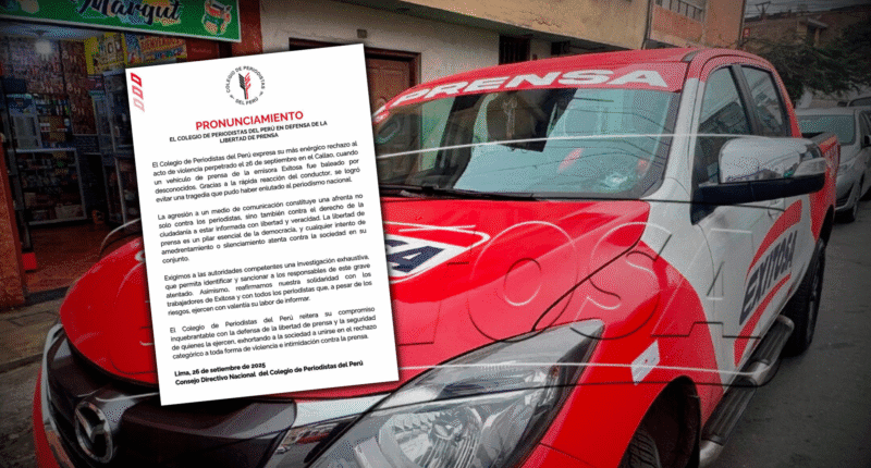 El Colegio de Periodistas del Perú rechazó el ataque perpetrado contra un vehículo de Exitosa en el Callao, donde delincuentes dispararon contra el conductor durante la madrugada del viernes 26. El hecho, calificado como un atentado contra la libertad de prensa, es investigado por la Policía Nacional.